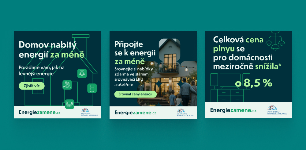 Jedním z hlavních výstupů spolupráce byla kreativní produkce pro kampaň „Energie za méně", propagující srovnávač cen energií provozovaný Energetickým regulačním úřadem (ERÚ). Vytvořili jsme kompletní sadu bannerových vizuálů ve všech potřebných formátech - od display a social media formátů po branding cross device. V průběhu kampaně jsme vizuály aktualizovali (nové sdělení, nové logo MPO, změna cílové URL), což v praxi znamenalo desítky souborů, přesně nulový prostor pro chybu a iterativní schvalovací proces s klientem.