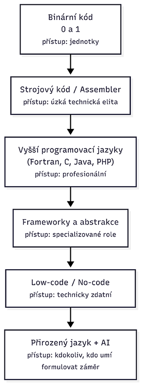 V tomto bodu se nevyhneme krátké historické vsuvce. Samostatné řemeslo programátorské začalo vznikat ve 40. letech minulého století společně s rozvojem počítačů. Klíčovou úlohou programátorů bylo analyzovat řešený problém, rozdělit ho na menší, algoritmizovatelné části, a ty pak převést do jazyka počítače, v úplných počátcích do nul a jedniček, pak do “strojového kódu”, nízko úrovňového jazyka Assembler, a od 50. let pak do vyšších programovacích jazyků jako Fortran. Ty představovaly první významnou úroveň abstrakce, protože programování v nich nevyžadovalo hlubokou znalost konstrukce počítačů, a otevřelo tak dveře do oboru všem s dostatečnou intelektuální výbavou, tedy cca 5 % populace.